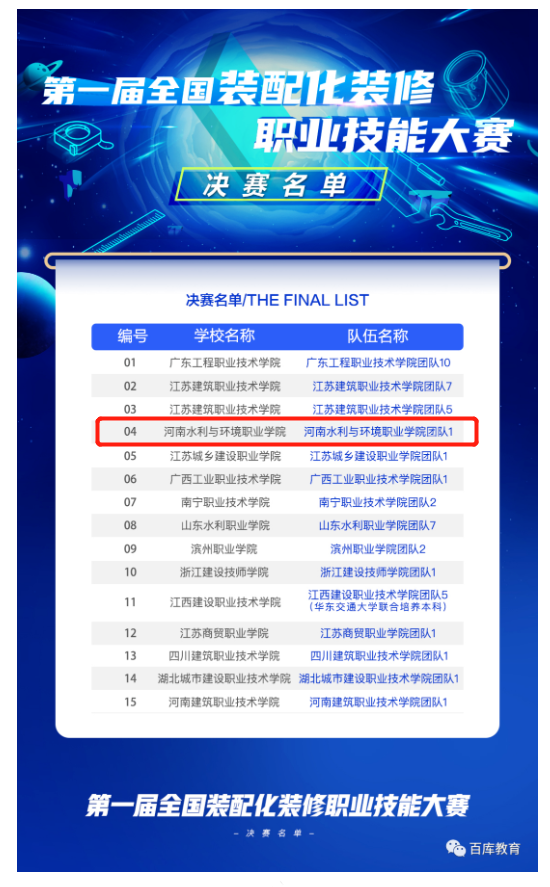 8月5日,由中国建材工业经济研究会和装配式建筑教学资源共建共享联盟主办,江苏建筑职业技术公司承办,山东百库教育科技有限公司协办的“第一届全国装配化装修职业技能大赛—选拔赛”如期举办。公司土木工程系两个参赛队不畏强手、奋勇争先,一支参赛队以总分第4名的优异成绩,成功进入“第一届装配化装修职业技能大赛——决赛”,另一支参赛队获得三等奖。