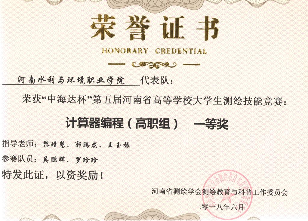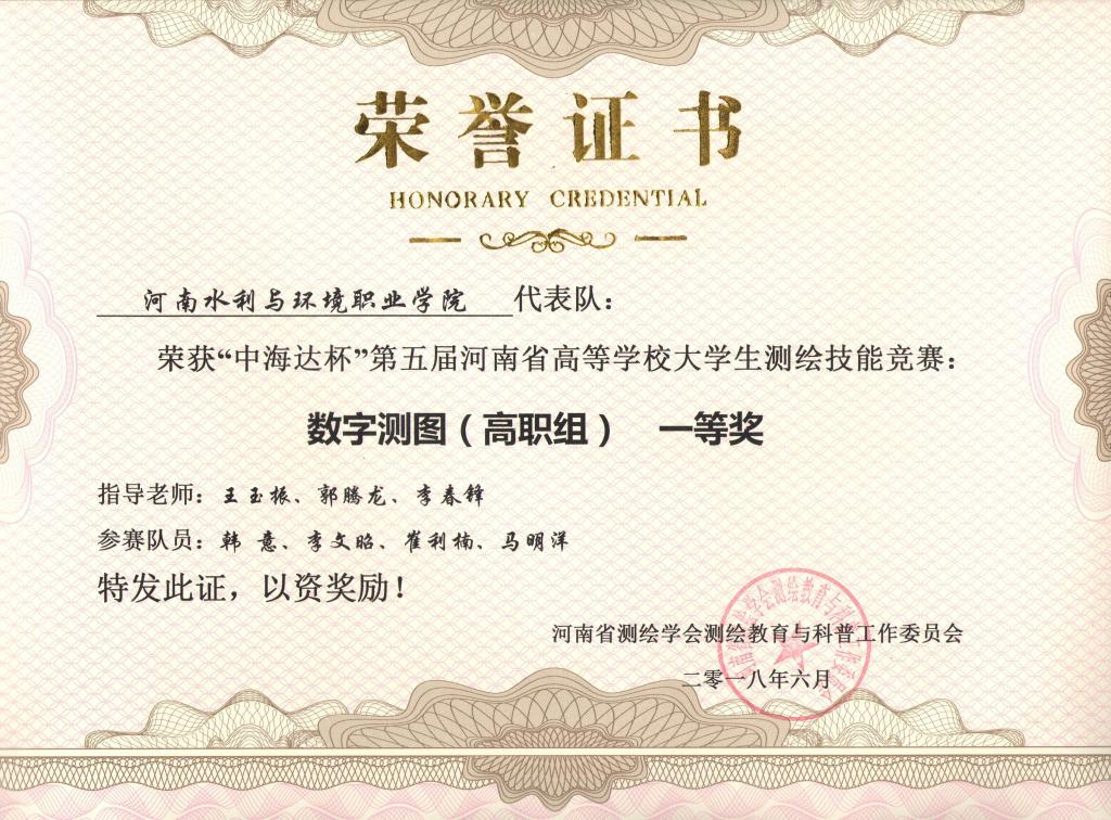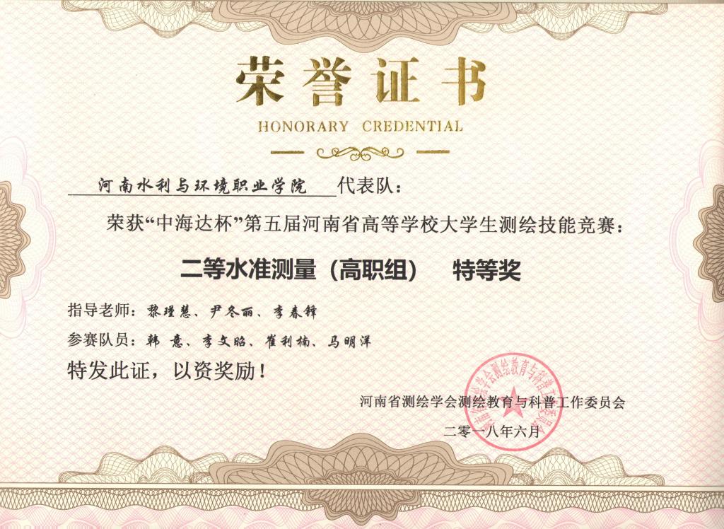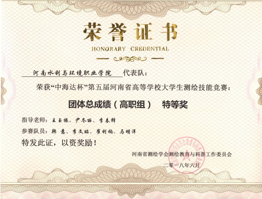 2018年6月18日,第五届“中海达杯”河南省高等公司老员工测绘技能竞赛在南阳师范公司开赛,此次比赛共有来自全省11所本科院校和9所高职院校参加比赛。我系参加了高职组的测绘类三个项目的比赛,经过激烈角逐,4位选手沉着应战、密切配合,最终荣获团体特等奖的优异成绩。通过与其他院校选手同场竞技,彰显了公司参赛选手的实力,并为公司赢得了荣誉。