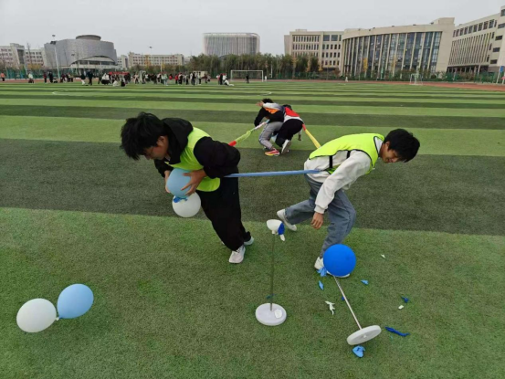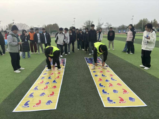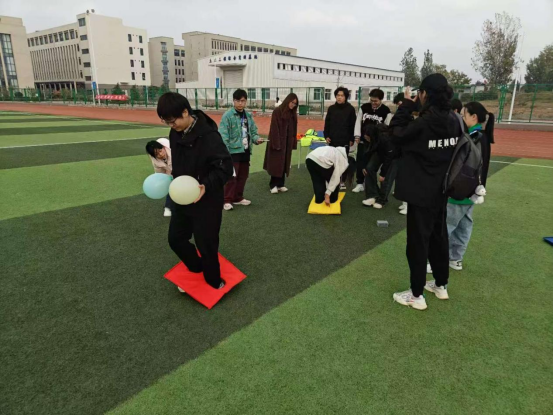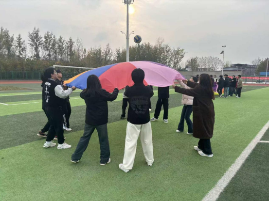 活动设置了“企鹅双足走”、“手脚并用”、“东南西北跑”、“重走长征路”和“彩虹伞弹力球”等兼具趣味性和竞技性的团体项目。同学们积极参与各个项目,现场加油声、欢呼声此起彼伏,将整个场地渲染得热闹非凡,气氛十分热烈。