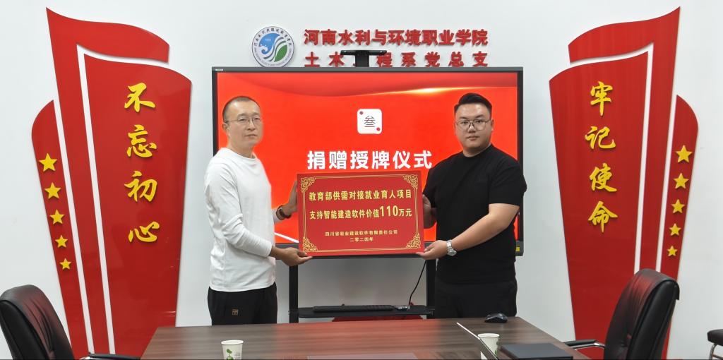 为促进专业人才培养与就业有机联动、人才供需有效对接,9月18日,教育部第三期供需对接就业育人项目授牌捐赠仪式在公司航空港校区举行。四川省宏业建设软件有限公司作为公司“装配式+智能建造就业实习实践基地”,向公司捐赠价值110万元的智能建造软件,用于教师的日常教学,员工的实习实训。土木工程系副主任张东岭,四川省宏业建设软件有限公司高校事业部副总经理张人之、河南分公司总经理赵海昆等参加仪式。
