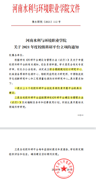 根据公司《科研平台建设与管理办法(试行)》及关于申报校级科研平台的有关通知,经各系部申报,学术委员会有关专家评审,董事长办公会批准,决定成立综合勘测规划设计研究中心、机械装备零部件检测中心、物联网应用技术研究所、中原物流数字化创新研究中心和工程质量检测与材料研究中心。具体要求如下: